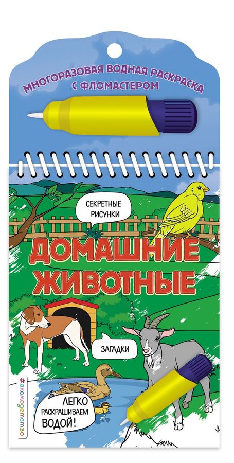 Раскрашивать водой легко: раскрутите фломастер, наполните водой и проведите им по чёрно-белым картонным страницам! Перед вами как по волшебству оживут яркие картинки с домашними животными. Когда страницы высохнут, их можно раскрашивать снова. Также здесь есть загадки, задания на мышление и внимание, а ещё – секретные рисунки, которые найдутся только при раскрашивании! Представляем новое поколение раскрасок! Во-первых, вам больше не нужны цветные карандаши или фломастеры. Просто наполните специальный фломастер, входящий в комплект, водой и проведите им по страницам — они сразу же станут цветными. Поэтому раскраской смогут пользоваться даже самые маленькие дети, только начинающие держать ручку. Во-вторых, эта раскраска многоразовая. После высыхания страницы из прочного картона снова станут чёрно-белыми, и их можно раскрашивать повторно. В-третьих, эта раскраска развивающая: на каждом развороте есть задания на внимание и мышление, стихотворные загадки и даже скрытые предметы, появляющиеся из ниоткуда! Раскрашивая реалистичные иллюстрации, ваш малыш с интересом познакомится с разными видами домашних животных.