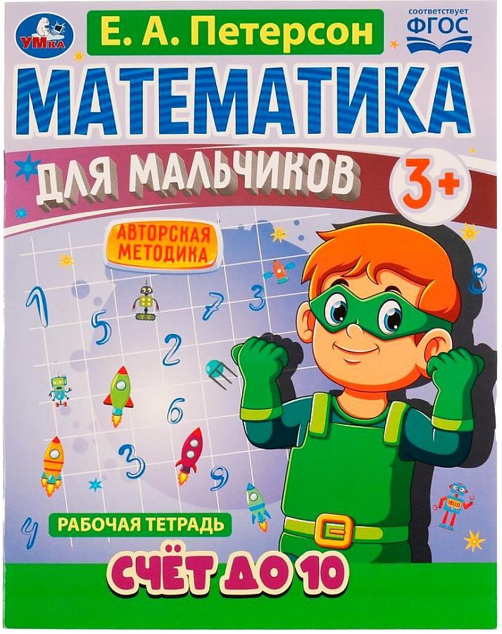 Рабочая тетрадь «Е. А. Петерсон. Счёт до 10. 3+» из серии «Математика для мальчиков ТМ «УМка» - отличный помощник для маленьких непосед в освоении новых знаний в области математики: - соответствует ФГОС - интересные задания - цветное оформление - авторская методика Данная рабочая тетрадь содержит комплекс увлекательных заданий по математике, разработанных в соответствии с уникальной авторской методикой Е. А. Петерсон. При их выполнении мальчики потренируют счёт до 10, а также разовьют внимательность и аккуратность. Специально подобранный для юных героев иллюстративный материал сделает обучение более интересным и эффективным. Для достижения хороших результатов достаточно заниматься с ребёнком по 20-25 минут в день, главное - хвалить его за успехи! Занятия с рабочей тетрадью ТМ «УМка» также способствуют развитию: - памяти - моторики - мышления - усидчивости