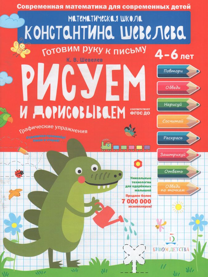 Шевелев Константин Валерьевич – педагог высшей категории, разработчик авторской образовательной программы "Математика для дошкольников". Новые тетради Константина Шевелева адресованы новому поколению детей и родителей. В них стало больше игровых заданий и ярких рисунков, но неизменными остались уникальные авторские методики и технологии. Задания в тетрадях разнообразны, их не скучно выполнять. Они выстроены от простого к сложному, а количество их таково, что ребёнок не устаёт! Есть и логические задачи, и творческие. Ребёнок рисует по клеточкам различные фигуры, дорисовывает, штрихует, проходит лабиринты, учится работать по плану. Выполняет задания на симметрию, повторяет счёт и фигуры. Развиваются техника письма, пространственные представления, логика и мышление, внимание и воображение, координация действий рук, речь. Тетради полностью соответствуют поставленной задаче: формирование простейших математических знаний. Прекрасно подходят для систематических занятий и подготовки к школе. В каждой тетради есть многоразовая страничка для тренировки. Ребёнок может тренироваться столько, сколько необходимо для хорошего результата. Идеально подходят для активных детей, которые нуждаются в чётко организованной системе занятий. Шаг за шагом, двигаясь от простого к сложному, развиваем трудолюбие, усидчивость, аккуратность, сосредоточенность. Дети, прошедшие полный курс занятий, всегда показывают отличные результаты в школе. Общий тираж пособий Константина Шевелева превысил 7 000 000 экземпляров! Это яркое свидетельство востребованности и эффективности его методики.