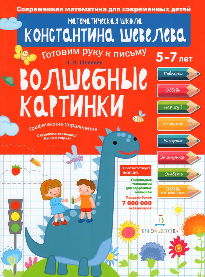 Развитая мелкая моторика и скоординированность действий рук — один из основных показателей интеллектуального развития ребёнка и, следовательно, его готовности к школе. Существует множество занятий, игр и упражнений для развития мелкой моторики. Один из наиболее эффективных способов — это формирование графических навыков. Именно на это и нацелены специальные упражнения в нашей тетради. Выполняя задания, дети срисовывают и дорисовывают разные предметы, раскрашивают их, обводят по штрихам целые рисунки и их фрагменты. Ребята учатся ориентироваться в лабиринте, по плану и в клетчатом пространстве. Играют в игры «Детское лото», «Морской бой». Определяют закономерности и рисуют узоры, фигуры, предметы, доводя рисунок до конца строчки. Срисовывают фигуры по точкам и заполняют таблицы. Повторяют количественный счёт в пределах первого десятка и решают логические задачи. Всё это развивает интеллект, внимание, память, речь, логическое и абстрактное мышление, умение ориентироваться в пространстве и на плоскости. Выполнение упражнений развивает координацию движения руки, формирует каллиграфические навыки. Развивается воля, фантазия, воображение. Воспитывается трудолюбие, усидчивость, сосредоточенность и аккуратность. Рабочая тетрадь создана на основе двадцатилетней практической работы Константина Шевелева с дошкольниками. Дети, прошедшие курс подготовки к школе по его методике, неоднократно становились победителями конкурсов, успешно поступали в гимназические классы, спецшколы и общеобразовательные школы. В дальнейшем показывали отличные результаты в учёбе, становились победителями окружных и городских математических олимпиад.