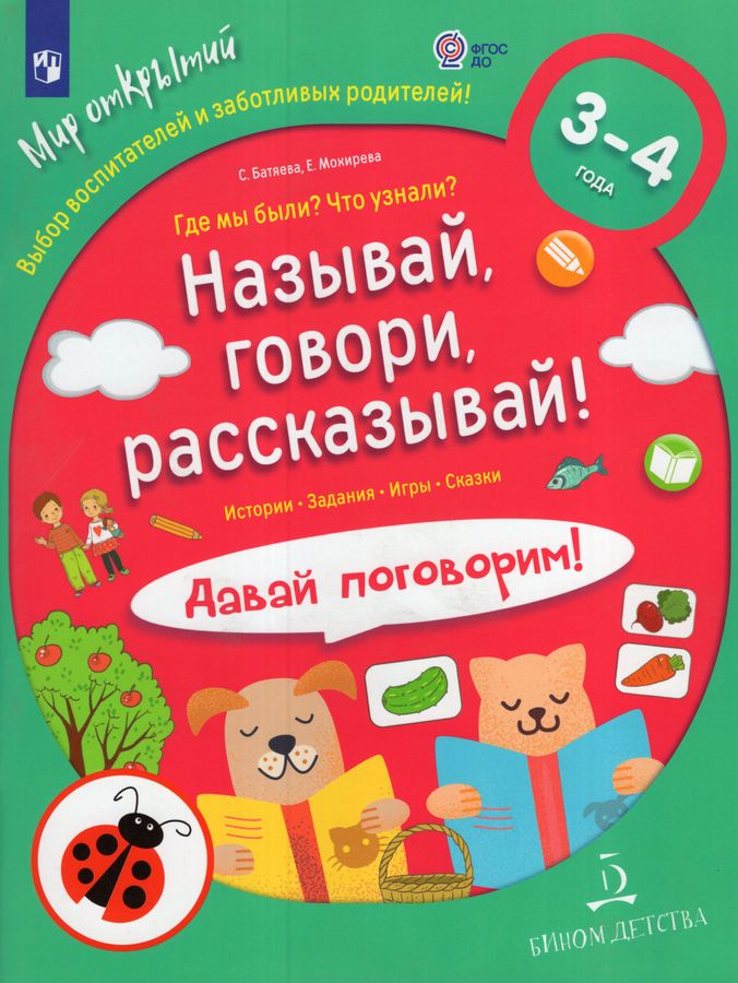 Комплект тетрадей "Давай поговорим!" разработан специально для программы дошкольного образования "Мир открытий". Светлана Батяева и Елена Мохирева - практикующие логопеды. Их тетради - это результат каждодневной работы с детьми, поэтому в них мало скуки, а много игры, интересных идей и заданий, фантазии. Комплект рассчитан на целый год занятий с малышами 3-4 лет. Тетради соответствуют требованиям ФГОС дошкольного образования, заниматься по ним можно как в детском саду, так и дома. Наша тетради - рабочие! Это значит, что в них можно и нужно рисовать, раскрашивать, приклеивать наклейки, что всегда нравится детям 3-4 лет. Но самое главное - все задания легко превращаются в настоящие живые игры за границами тетрадей! На прогулке в парке и дома на кухне, в магазине и детском кафе. С мячом, с тетрадкой и карандашами, с игрушками, одеждой, кастрюльками и сковородками. Играйте и говорите, общайтесь, обсуждайте все, что видите вокруг, слушайте внимательно, будьте вместе со своими любимыми малышами.