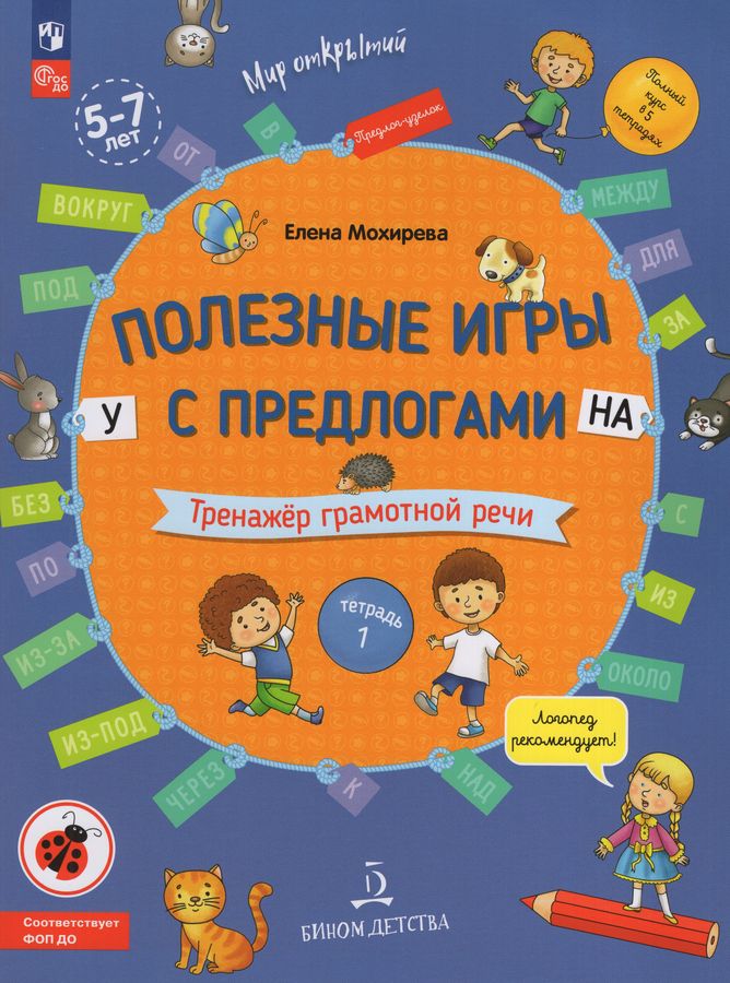 Почему так важны предлоги? •Их неправильное употребление приводит к трудностям в овладении письменной речью. •При нечётком или неверном употреблении искажается не только представление об окружающем, но и смысл сказанного. •Эффективные упражнения-тренажеры сформируют правильный навык использования предлогов У, НА и перенесут это умение в спонтанную речь. И все это в виде увлекательной игры с историями, веселыми заданиями, загадками и скороговорками, логическими лабиринтами и картинками-перевертышами. Е. А. Мохирева – практикующий учитель-логопед высшей квалификационной категории, автор популярных пособий по развитию речи и социальной адаптации детей. Эксперт материалов Московского городского профессионального конкурса «Педагог года Москвы-2019». Дипломант I степени «Большого Фестиваля дошкольного образования» (2020) Комплект входит в программу дошкольного образования «Мир открытий». Подготовлено 5 тренажеров по всем группам предлогов.