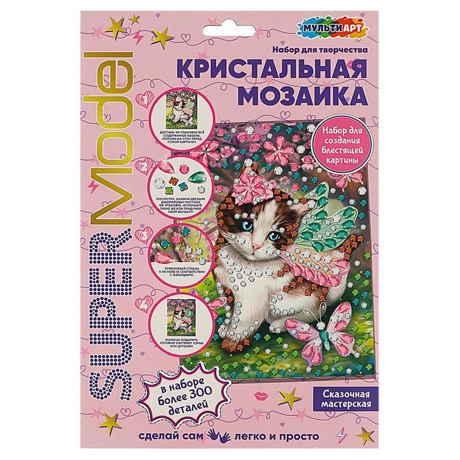 Набор для творчества – кристальная мозаика «СуперМодель. Животные» ТМ «Мульти Арт» - отличный подарок для ребёнка, который будет способствовать развитию его творческих способностей. Особенности и комплектация: - более 300 деталей - 3 вида страз: капля, круг, квадрат - без клея и ножниц - понятная инструкция При помощи этого набора маленькая художница сможет создать блестящую картину с изображением очаровательного котёнка, декорированную сверкающими стразами. Готовая поделка станет отличным вариантом для подарка близким или для украшения интерьера детской комнаты. Творческие занятия с кристальной мозаикой ТМ «Мульти Арт» обладают успокаивающим действием, а также развивают: - творческое мышление - цветовое восприятие - усидчивость - внимание - аккуратность Размер: 17 х 23 см. Материал: картон + пластмасса. Рекомендовано детям от 3-х лет.