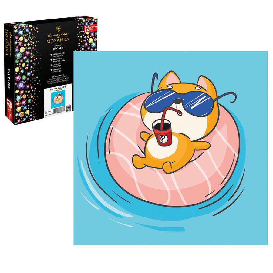 Набор для творчества Алмазная мозаика с частичной выкладкой арт. 65598 / 25 КОРГИ В БАССЕЙНЕ, размер: 15*15 см, (10 цветов страз, холст на подрамнике с напечатанной картиной, покрытый клеевым слоем и защитной пленкой, пакеты со стразами, стилус, лоток для страз, силикон для страз, клей, подвесы для подрамника, пинцет металлический, схема, дополнительные пакеты с zip-молнией, стикеры для нумерации zip-пакетов в комплекте, форма страз: круглая, тип выкладки: частичная, картонная коробка с европодвесом)