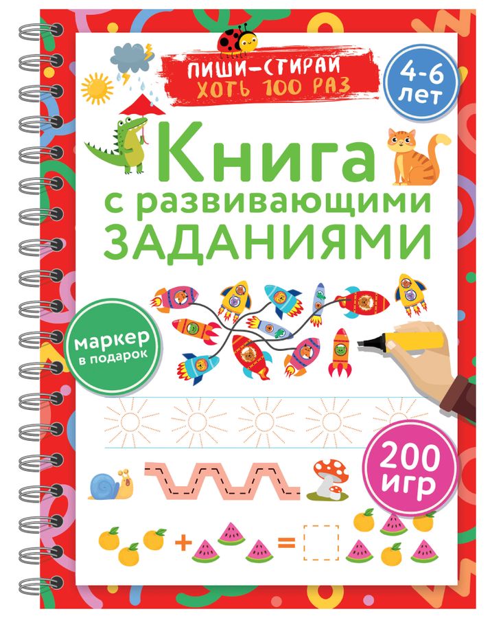 "Книга с развивающими заданиями. Пиши–стирай. 4–6 лет" — удобная и полезная многоразовая рабочая тетрадь большого формата, в которой можно писать, рисовать и стирать хоть 100 раз! Малыша ждут игры с буквами и словами, игры с цифрами и числами, занимательные задания для развития внимания, логики, памяти, мелкой моторики, пространственного мышления. Мелованный картон и ламинированные страницы делают книгу прочной и износостойкой. Благодаря спирали ребёнку легко и удобно перелистывать плотные страницы. Книгу можно использовать дома, на занятиях в детском саду и даже в дороге. Для дошкольного возраста.