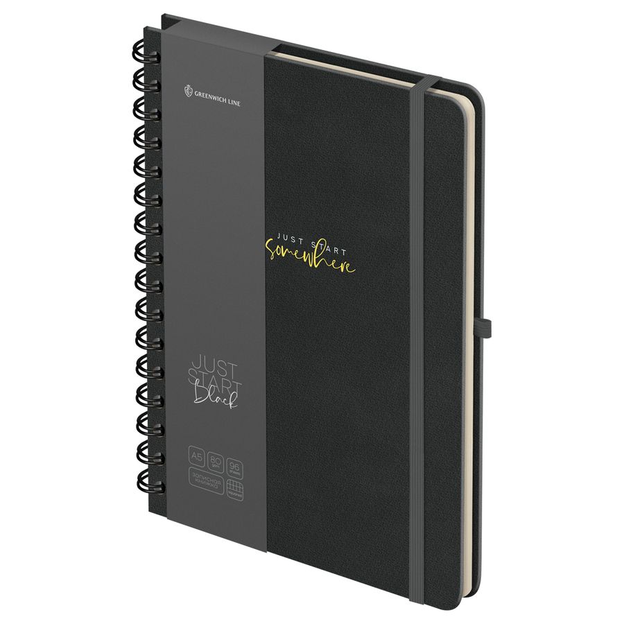 Записная книжка Greenwich Line "Just start. Black" формата А5 — отличный помощник для фиксирования срочной информации, ведении ежедневных заметок. Размер — 143*210 мм. Линовка — клетка. Твёрдая обложка со скруглёнными уголками изготовлена из приятной на ощупь экокожи с эффектом замши. Она дополнена фольгированной надписью. Удобное крепление на гребне позволяет раскрывать книжку на 360 градусов и удалять ненужные листы. Внутренний блок состоит из 96 листов бумаги цвета слоновой кости повышенной плотности 80 г/кв.м. Книжка закрывается на резинку, что дополнительно защищает листы от замятий и загрязнений. Она оснащена петлёй для ручки, с помощью которого пишущий инструмент будет всегда под рукой и не потеряется. Изделие поставляется в индивидуальной упаковке. • Формат: А5 (143*210 мм); • Количество листов: 96; • Линовка: клетка; • Плотность блока: 80 г/кв.м; • Материал обложки: экокожа с эффектом замши; • Тип скрепления: гребень; • Петля для ручки.