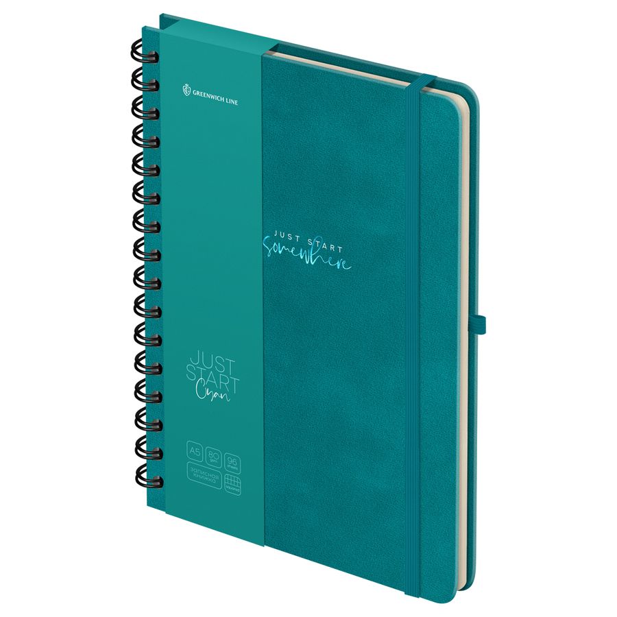Записная книжка Greenwich Line "Just start. Cyan" формата А5 — отличный помощник для фиксирования срочной информации, ведении ежедневных заметок. Размер — 143*210 мм. Линовка — клетка. Твёрдая обложка со скруглёнными уголками изготовлена из приятной на ощупь экокожи с эффектом замши. Она дополнена фольгированной надписью. Удобное крепление на гребне позволяет раскрывать книжку на 360 градусов и легко удалять ненужные листы. Внутренний блок состоит из 96 листов бумаги цвета слоновой кости повышенной плотности 80 г/кв.м. Книжка закрывается на резинку, что дополнительно защищает листы от замятий и загрязнений. Она оснащена петлёй для ручки, с помощью которого пишущий инструмент будет всегда под рукой и не потеряется. Изделие поставляется в индивидуальной упаковке. • Формат: А5 (143*210 мм); • Количество листов: 96; • Линовка: клетка; • Плотность блока: 80 г/кв.м; • Материал обложки: экокожа с эффектом замши; • Тип скрепления: гребень; • Петля для ручки.