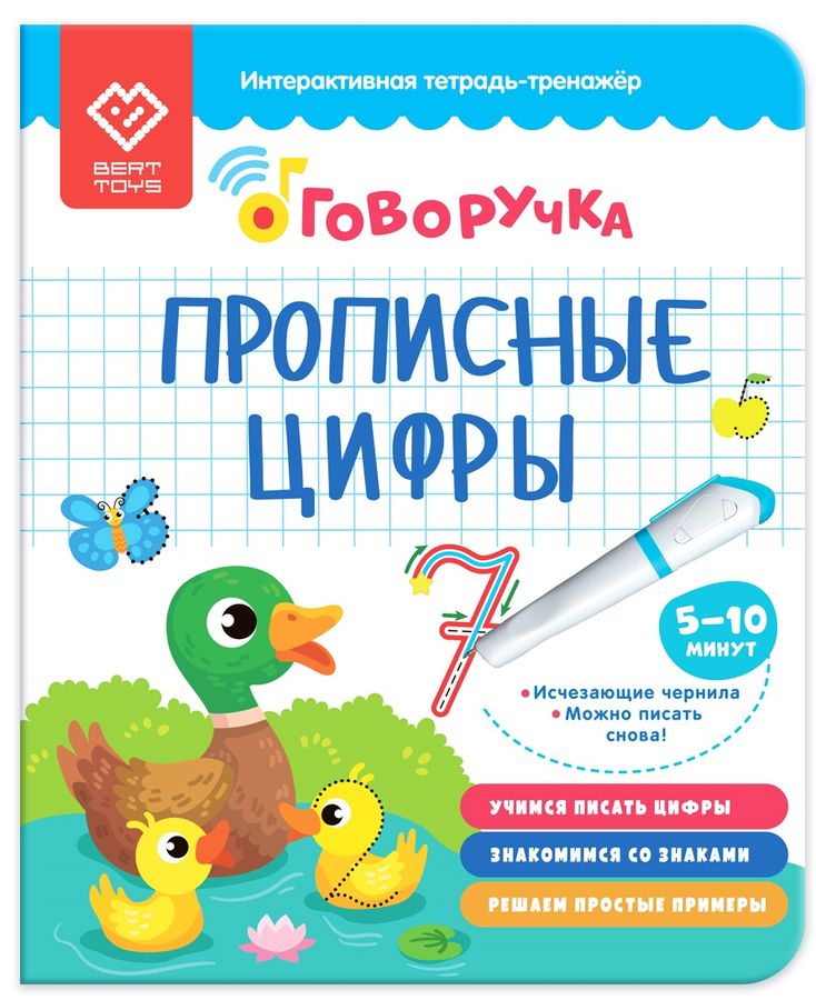 В тетради 22 страницы. Задания и прописи для подготовки к школе и тренировке почерка. Повторять задания можно неограниченное количество раз благодаря стержням с исчезающими чернилами в Говоручке. Исчезающие чернила Уникальная особенность занятий с тетрадями — возможность писать исчезающими чернилами. Дети обязательно захотят попробовать стать волшебниками и с интересом начнут выполнять задания. Волшебные чернила исчезают через 5–10 минут. Можно тренироваться снова и снова, с каждым разом улучшая результат. Надежность и польза Тетради изготовлены из плотной бумаги, подходят для многократного использования. На каждом развороте разнообразные задания и обучающие игры, знакомство с буквами и цифрами, первые задачи для подготовки к школе. Взаимодействие с Говоручкой Каждый текст и картинка озвучиваются с помощью Говоручки — достаточно поднести ручку к звёздочке или любой картинке.