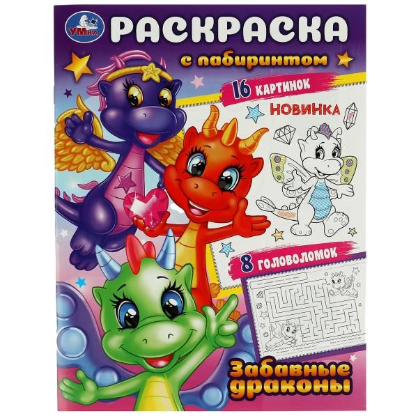 Раскраска с лабиринтом «Забавные драконы» ТМ «УМка» - отличный подарок для маленьких художников: - 16 тщательно прорисованных картинок для раскрашивания - 8 головоломок - короткие сюжетные тексты - милые персонажи Эта увлекательная раскраска с лабиринтом и головоломками обязательно понравится вашему ребёнку. Решение интересных задачек улучшит внимание и логическое мышление. Раскрашивание очаровательных дракончиков подарит хорошее настроение и поможет развитию мелкой моторики. Игровые занятия с раскраской ТМ «УМка» подготавливают руку к письму и развивают также: - творческие способности - память - усидчивость Объём: 16 стр. Формат: 195 х 255 мм. Материал: офсетная бумага. Рекомендовано детям старшего дошкольного возраста.