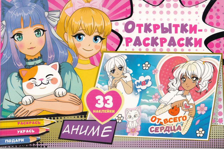 Открытки-раскраски с наклейками "Аниме ". Раскрашивай, фантазируй и создавай неповторимые открытки с любимыми героями. Это отличный подарок для друзей и близких на все случаи жизни! Выбери понравившуюся открытку, раскрась, как тебе нравится, укрась наклей