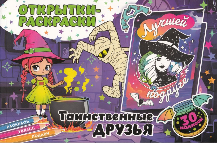 Открытки-раскраски с наклейками "Таинственные друзья ". Раскрашивай, фантазируй и создавай неповторимые открытки с любимыми героями. Это отличный подарок для друзей и близких на все случаи жизни! Выбери понравившуюся открытку, раскрась, как тебе нравится,