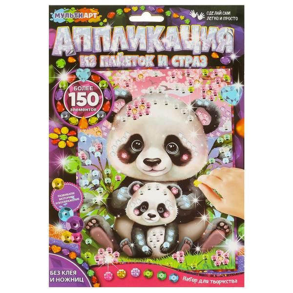 Набор для творчества - аппликация из пайеток и страз «Панды» ТМ «Мульти Арт» - отличный подарок для вашего ребёнка, который будет способствовать развитию его творческих способностей. Особенности и комплектация: - более 150 деталей - картонная основа для аппликации - комплект самоклеящихся стразов - комплект разноцветных пайеток - клеевая основа для пайеток - без клея и ножниц С помощью этого набора юный художник сможет самостоятельно создать сверкающую аппликацию с изображением очаровательных панд - мамы и её малыша. Готовую поделку можно подарить близким или использовать для украшения интерьера. Творческие занятия с набором ТМ «Мульти Арт» развивают: - внимание и усидчивость - творческое мышление - сенсорное и цветовое восприятие - моторику рук - фантазию и воображение Размер: 17 х 23 см. Материал: картон + пластмасса. Рекомендовано детям от 3-х лет.