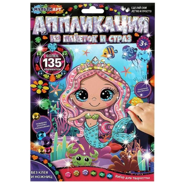 Набор для творчества - аппликация со стразами и пайетками «Русалка» из серии «Сказочная мастерская» ТМ «Мульти Арт» - отличный подарок для вашего ребёнка, который будет способствовать развитию его творческих способностей. Особенности и комплектация: - основа для аппликации - комплект самоклеящихся стразов - комплект разноцветных пайеток - более 130 деталей - без клея и ножниц С помощью этого набора юный художник сможет самостоятельно создать сверкающую аппликацию с изображением милой русалочки. Готовую поделку можно подарить близким или использовать для украшения интерьера. Творческие занятия с набором ТМ «Мульти Арт» развивают: - внимание и усидчивость - творческое мышление - сенсорное и цветовое восприятие - моторику рук - фантазию и воображение Размер: 17 х 23 см. Материал: картон + пластмасса. Рекомендовано детям от 3-х лет.