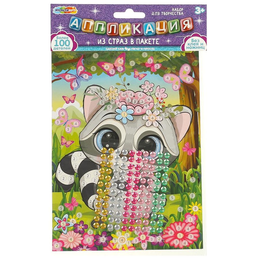 Набор для творчества - аппликация из страз «Милые животные» ТМ «Мульти Арт» - отличный подарок для ребёнка, который будет способствовать развитию его творческих способностей. Комплектация и особенности: - пронумерованная картонная основа для аппликации - более 100 деталей - без клея и ножниц - безопасно для детей С помощью красочной основы и разноцветных сверкающих страз маленькая художница сможет самостоятельно создать блестящую картинку с изображением очаровательного енота. Готовую поделку можно подарить близким или использовать для украшения интерьера. Занятия с наборами для творчества ТМ «Мульти Арт» развивают: - внимание и усидчивость - творческое мышление - сенсорное и цветовое восприятие - моторику рук - воображение Размер основы: 15 х 21 см. Материал: картон + пластмасса. Рекомендовано детям от 3-х лет.