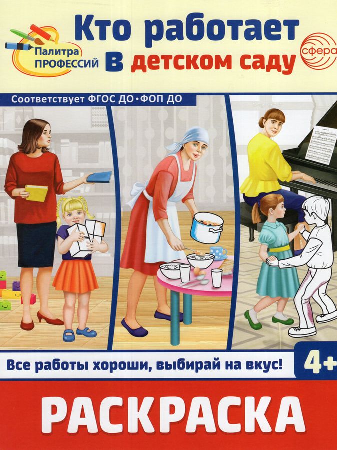 Серия раскрасок «Палитра профессий» познакомит дошкольников с различными профессиями, поможет развить мелкую моторику и подготовить руку к письму. Каждый сюжет раскраски сопровождается стихотворением. Благодаря чётким детальным изображениям, мальчики и девочки легко догадаются, кто показан на картинке. Раскрашивая страницу за страницей, дети узнают, чем занимаются работники детского сада, поймут важность каждой профессии: от воспитателя до охранника. Материалы раскраски подготовлены в соответствии с ФГОС ДО. В раскраске «Кто работает в детском саду» представлены следующие профессии: воспитатель, помощник воспитателя, логопед, повар, медицинская сестра, музыкальный руководитель, логопед, охранник. Для более полного рассказа о профессиях рекомендуется использовать комплекты карточек серии «Мир профессий»