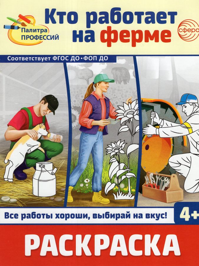 Серия раскрасок «Палитра профессий» познакомит дошкольников с различными профессиями, поможет развить мелкую моторику и подготовить руку к письму. Каждый сюжет раскраски сопровождается стихотворением. Благодаря чётким детальным изображениям, мальчики и девочки легко догадаются, кто показан на картинке. Раскрашивая страницу за страницей, дети узнают, чем занимаются работники фермы: от агронома до пчеловода. Материалы раскраски подготовлены в соответствии с ФГОС ДО. В раскраске «Кто работает на ферме» представлены следующие профессии: агроном, овощевод, доярка, пчеловод. ветеринар. зоотехник. рыбовод, механизатор. Для более полного рассказа о профессиях рекомендуется использовать комплекты карточек серии «Мир профессий»