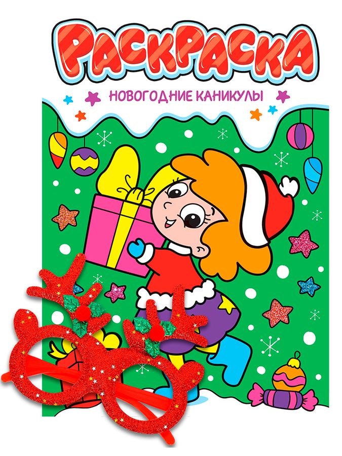 Серия "Новогодняя раскраска" - это прекрасный подарок для ребёнка. Красивые иллюстрации создадут праздничное настроение и увлекут мальчишек и девчонок на долгое время. Раскраска большого размера, бумага в блоке достаточно плотная, чтобы дети могли использовать для раскрашивания как карандаши, так и фломастеры. В комплекте к раскраске идут сверкающие новогодние очки с рожками. Этот аксессуар сделает новогодний образ еще более праздничным!