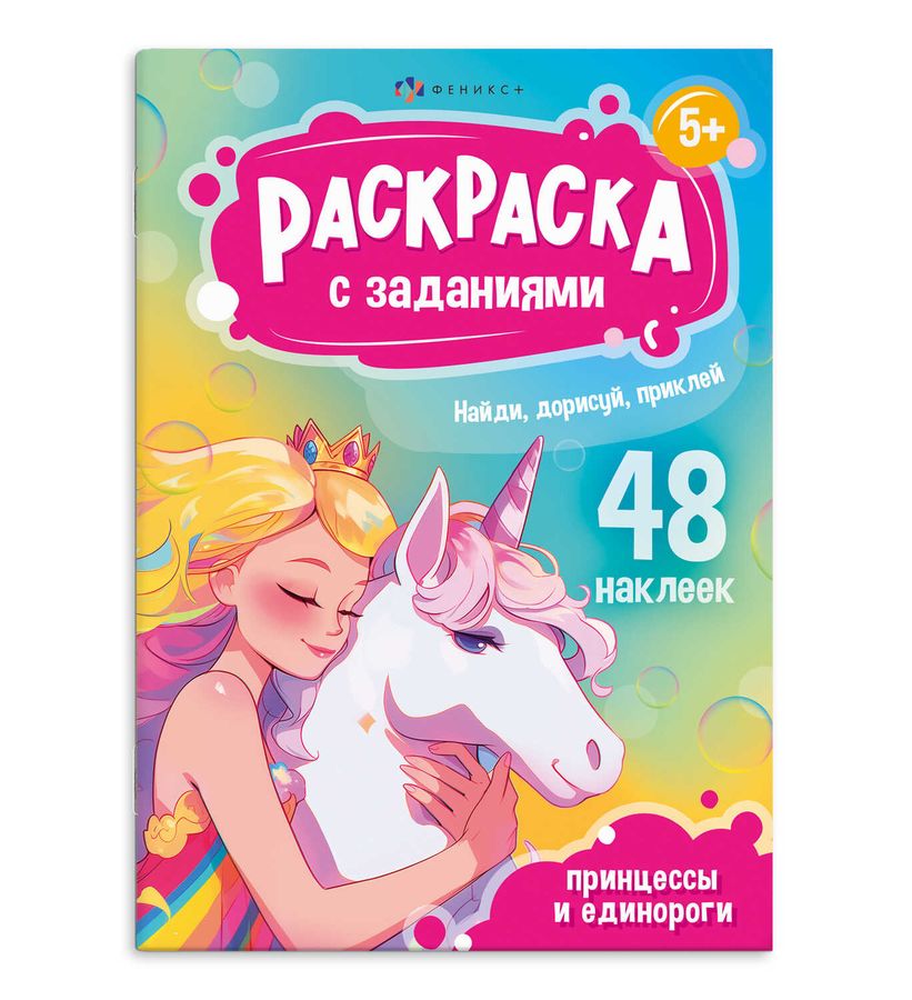 Книжка-раскраска для детей. Серия «Раскраски А5 с заданиями и наклейками» арт. 69331 ПРИНЦЕССЫ И ЕДИНОРОГИ /165х235 мм, 8 л., блок - офсет 100 г/м², печать в одну краску, мягкий переплёт (2 скобы).