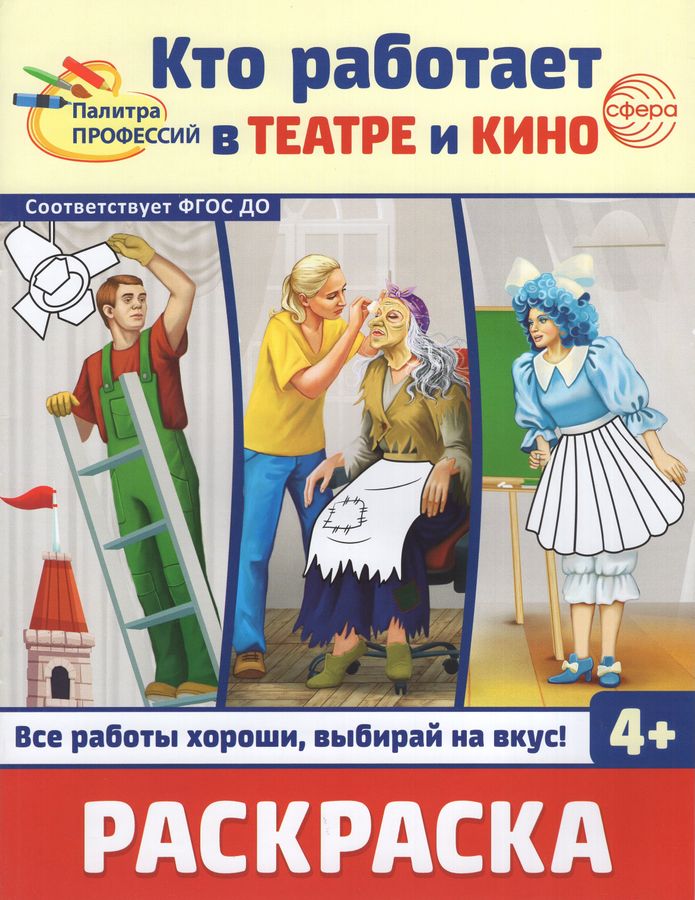 Раскраска познакомит дошкольников с профессиями людей, работающих в театре и на съемочной площадке, поможет развить мелкую моторику и подготовить руку к письму. Каждый сюжет раскраски сопровождается стихотворением. Благодаря четким детальным изображениям, мальчики и девочки легко догадаются, кто показан на картинках. Раскрашивая страницу за страницей, дети поймут важность каждой профессии: от режиссера до осветителя. Полностью раскрасив рисунки, дети вместе с родителями смогут придумать историю о постановке в театре любимой сказки или съемке приключенческого фильма. Желаем удачи!