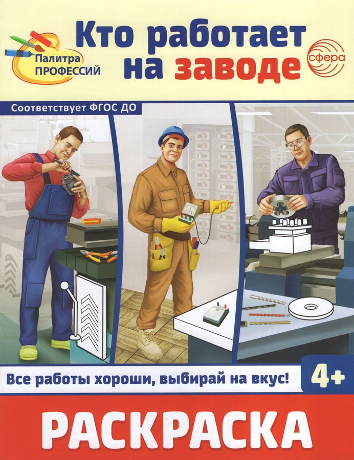 Раскраска познакомит дошкольников с профессиями людей, работающих на заводе, поможет развить мелкую моторику и подготовить руку к письму. Каждый сюжет раскраски сопровождается стихотворением. Благодаря четким детальным изображениям, мальчики и девочки легко догадаются, кто показан на картинках. Раскрашивая страницу за страницей, дети поймут важность каждой профессии: от инженера-конструктора до электромонтера. Полностью раскрасив рисунки, дети вместе с родителями смогут придумать историю о людях разных заводских специальностей, рассказать, чем полезен и важен их труд. Желаем удачи!