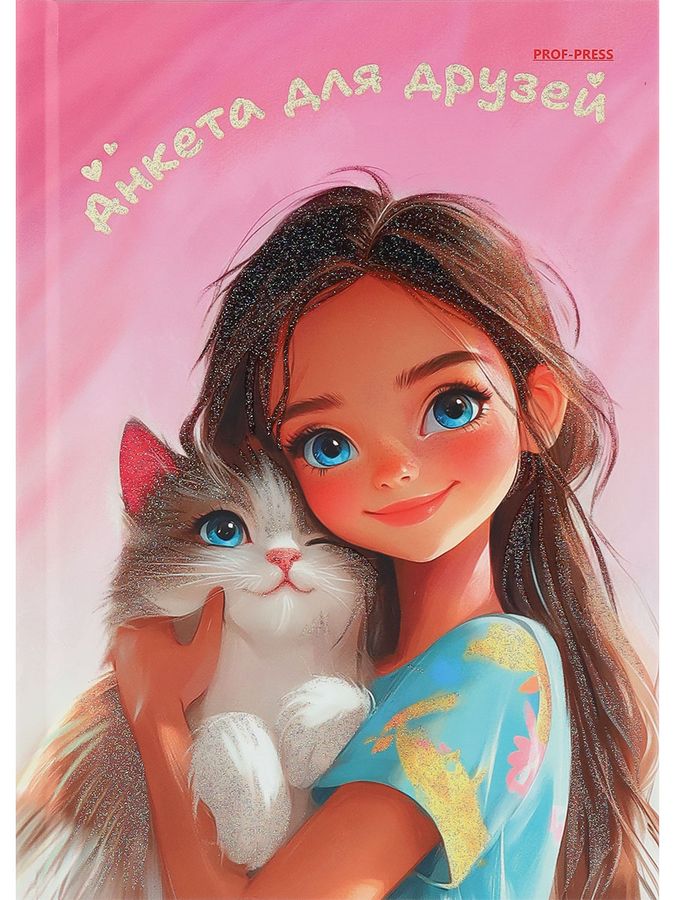 Анкета для друзей — оригинальный, стильный и яркий способ узнать все интересы и увлечения близких подруг. Анкета содержит множество вопросов о хобби, увлечениях, вкусах друг друга. В анкете есть вопросы о знаках зодиака, месте рождения, любимых книгах и фильмах, домашних животных и многое другое. Изготовлена в формате А5, 112 листов. Модель имеет твёрдый переплёт (7БЦ), который сохранит опрятный внешний вид на долгое время. Цветная мелованная обложка, украшенная глиттером.