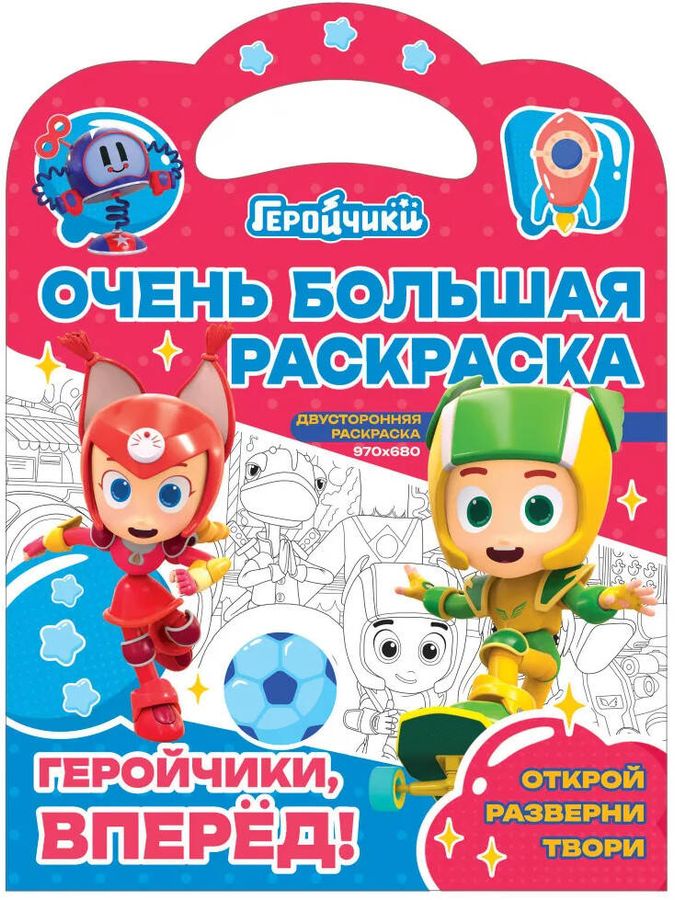 Очень большая раскраска Геройчики, вперед! понравится всем, кто любит рисовать и раскрашивать! Двусторонняя раскраска-плакат размером 970 на 680 мм сложена в книгу с яркой обложкой. Раскраска для детей имеет картонную ручку, поэтому разукрашку удобно носить. Бумажная раскраска с большим полем для раскрашивания и образы персонажей мультсериала Геройчики помогут развить творческие способности ребенка, фантазию и усидчивость. Умная раскраска содержит большие элементы и элементы поменьше, чтобы процесс раскрашивания был более увлекательным. Детская раскраска большого размера - это идеальный вариант для досуга: можно раскрашивать одному, с друзьями или всей семьей. Раскраска антистресс подходит для раскрашивания карандашами, цветными ручками, фломастерами, маркерами на водной основе. Наши раскраски понравятся не только детям, но и взрослым. Скрасить досуг и расслабиться помогут наши раскраски для взрослых и детей. Раскраску для малышей можно разложить на полу, раскраски антистресс взрослые можно повесить на стену или расположить на большом столе. Раскраска для мальчиков или раскраска для девочек с любимыми героями отлично подойдет для подарка на День Рождения, выпускной в детском саду, Новый год, 23 февраля, 8 марта и как развлечение для любого детского праздника.