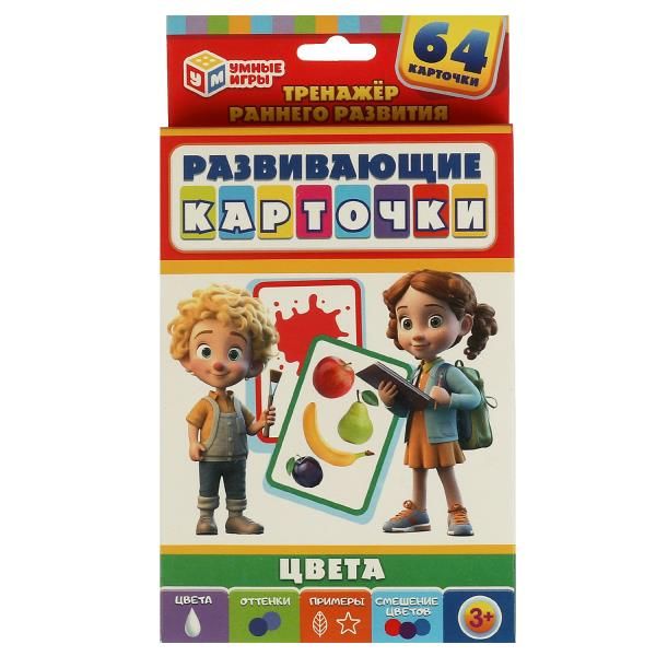 Развивающие карточки «Цвета» ТМ «Умные игры» - это настоящий тренажёр раннего развития: - 64 карточки - крупные красочные изображения - обучение цветам, оттенкам, смешиванию цветов - интересные упражнения - методические подсказки для взрослого Этот набор с красочными карточками из плотного картона познакомит ребёнка с понятием «цвет». Для лёгкого запоминания на карточке изображены также примеры. Компактный набор удобно брать с собой - теперь в дороге можно играть и учиться. Занятия с карточками ТМ «Умные игры» расширяют кругозор и развивают: - память - логическое мышление - речь - мелкую моторику - внимание Размер коробки: 110 х 160 х 20 мм. Материал: картон. Рекомендовано детям от 3-х лет.