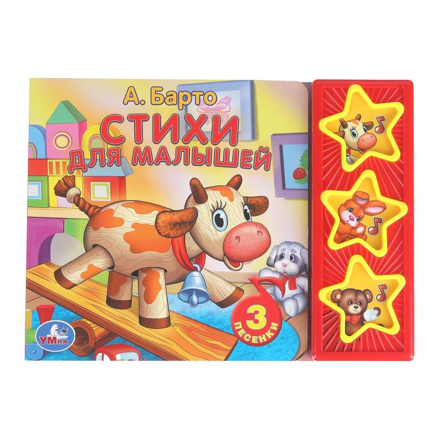 Музыкальная книжка «А. Барто. Стихи для малышей» ТМ «УМка» станет прекрасным подарком для ребёнка: - 3 звуковые кнопки - 3 песни на стихи Агнии Барто: «Бычок», «Зайка», «Мишка» - красочные иллюстрации - отдельная кнопка «Вкл./Выкл.» на обороте Малыш будет с удовольствием рассматривать яркие картинки, читать вместе с родителями добрые стихи Агнии Барто, слушать песенки и подпевать. Ребёнок легко освоит включение звука: по нажатию на кнопку звук включится, при втором нажатии выключится. Книжка сделана из плотного картона, поэтому родители могут не опасаться за её сохранность. Благодаря компактному формату её удобно брать с собой в путешествия. Игра с музыкальной книгой ТМ «УМка» развивает: - слуховое восприятие и музыкальный слух - навыки чтения - фантазию - образное мышление - память Объём: 6 стр. Формат: 206 х 150 мм. Материал: картон + пластмасса. Работает от 3-х батареек типа LR44 (в комплекте). Рекомендовано детям младшего дошкольного возраста.