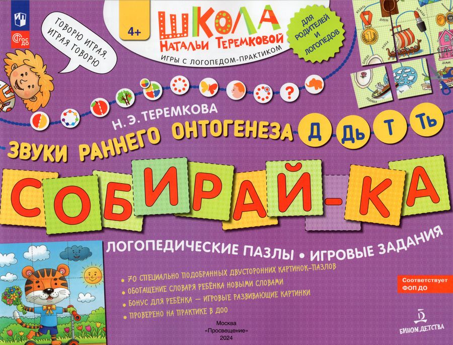 «ШКОЛА НАТАЛЬИ ТЕРЕМКОВОЙ» - это уникальный материал для игровых занятий с ребёнком на коррекцию всех групп звуков. Пособия Натальи Теремковой знает каждый педагог-практик - в ДОО, в частных детских садах и в центрах развития. Учителя-логопеды получают полностью методически проработанный материал для организации системных занятий. Родителям предоставляется возможность закрепить результат занятий с ребёнком в домашних условиях. Игры просты и доступны, разобраться в них сможет любой заинтересованный родитель. В комплект входят пять альбомов, направленных на закрепление звуков раннего онтогенеза у детей разных возрастных групп. Задача комплекта - автоматизация и дифференциация проблемных звуков, обогащение словарного запаса ребёнка, развитие зрительного восприятия, внимания, пространственной ориентации и мелкой моторики рук. Занятия организуются в форме занимательной игры: ребёнок собирает пазлы, пользуясь визуальными подсказками, и помогает весёлым героям выполнить увлекательные задания.