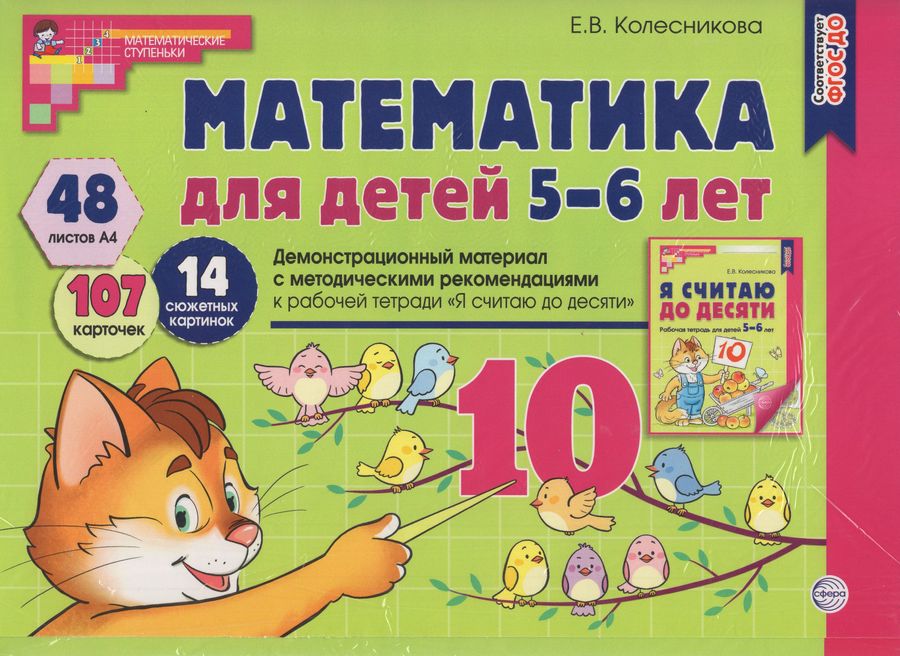 Демонстрационный материал предназначен для работы педагога с детьми 5-6 лет на занятиях по развитию математических представлений. Комплект разрезных карточек разработан в соответствии с содержанием книги «Математика для дошкольников 5-6 лет» и ра6очей тетради «Я считаю до десяти». Материал карточек соответствует содержанию раздела «Развитие математических представлений» в комплексных программах «Истоки», «Радуга», «Детство», «От рождения до школы» и т.д. Представлены следующие разделы: количество и счет, геометрические фигуры, величина, ориентировка во времени, ориентировка в пространстве, логические задачи, развитие внимания. Рекомендуется педагогам дошкольных о6разовательных учреждений, гувернёрам, родителям для занятий с детьми 5-6 лет.