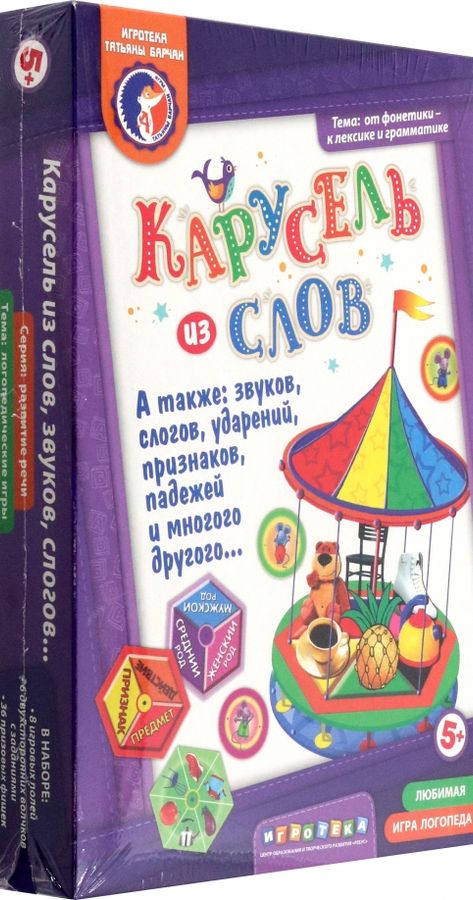 Некоторые предметы, которыми мы с удовольствием пользуемся, не нуждаются в мудреных инструкциях по применению. Карандаш, например, или мяч. Или наша игра - настоящее сокровище для тех, кому нравится импровизировать, придумывать новые полезные задания и головоломки. На десяти листах "Карусели…" только на первый взгляд царит хаос. Все становится на свои места после того, как поставлена задача. Допустим, найти на карточке предмет, название которого начинается на мягкий звук "ль": "Лейка, лимон, листик…" Или назвать слово, состоящее из 2-х слогов: "свеча". Или назвать все одушевленные предметы.… И за правильный ответ получить призовую фишку. А еще в игре можно использовать шестигранный волчок и в зависимости от "выпавшей" после его остановки картинки найти, к примеру, фрукт, или - игрушку, или - предмет синего цвета, или - назвать существительное среднего рода. Для всего этого нужно быть очень внимательным, знать правильные названия, помнить о вопросе и не медлить с ответом. Что особенно ценно в нашей необычной игре, так это возможность придумывать "на ходу" и называть предметы так, как этого требует ситуация: например, лампу можно назвать и "светильником", и "торшером", шляпку - "панамой", а клубнику в корзинке - "урожаем" или "ягодой". А придумать притяжательное прилагательное? "Бабушкины валенки", " папин портфель", " заячья капуста"… Найти антонимы: "мягкий - твердый", "сладкий - горький"… Сколько еще вариантов и остановок на карусели из слов? В какую сторону она может завертеться? С какой скоростью? Все зависит от вас - только держитесь крепче! В наборе: 8 игровых полей 36 призовых фишек 6 двухсторонних волчков с заданиями. Для детей от 5 лет.