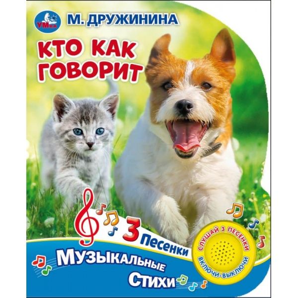 Музыкальная книга «М. Дружинина. Кто как говорит» ТМ «УМка» станет прекрасным подарком для малыша: - 1 звуковая кнопка - 3 песни на стихи Марины Дружининой: «Кошка», «Козлёнок», «Петух» - интересные стихотворения - реалистичные фотографии животных - фигурная вырубка Ребёнок с удовольствием будет листать плотные страницы, рассматривать яркие картинки, вместе с родителями читать добрые стихи про животных и слушать мелодичные песенки, знакомясь таким образом с окружающим миром. Малыш легко освоит включение звука: по нажатию на кнопку песенка включится, при втором нажатии выключится, при третьем - заиграет следующая композиция и т.д. Благодаря компактному размеру книгу удобно взять с собой в дорогу. Чтение музыкальной книги ТМ «УМка» и игра с ней развивают: - слуховое восприятие - навык чтения - фантазию - образное мышление - память Объём: 8 стр. Формат: 152 х 185 мм. Материал: пластмасса + картон. Работает от 3-х батареек типа LR1130 (в комплекте). Рекомендовано детям младшего дошкольного возраста.