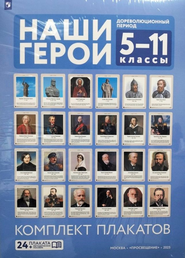 Комплект плакатов «Наши герои. Дореволюционный период» подготовлен в соответствии с информационными материалами «Наши герои» (Письмо Министерства просвещения РФ от 8 июня 2023 г. № АБ-2447/06 «О направлении информации»). Он направлен на воспитание у подрастающего поколения чувства причастности к историко-культурной общности российского народа и судьбе России. Предназначен для использования образовательными организациями и организациями отдыха и оздоровления детей при реализации рабочих программ воспитания, проведении просветительской работы, организации тематических мероприятий с участием детей и молодёжи, а также при оформлении музейно-выставочных пространств. Частью комплекта является методическое пособие, которое включает дополнительные материалы к биографиям выдающихся российских государственных деятелей и деятелей культуры: материалы для подготовки беседы, лекции педагога, организации проектной и другой работы со школьниками по освоению многообразного цивилизационного наследия россиян.