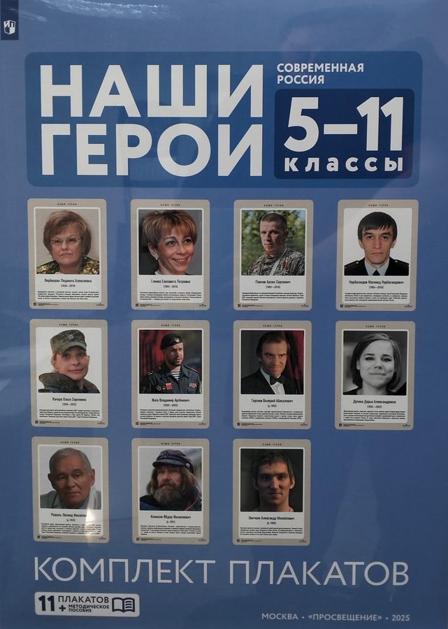 Комплект из 11 плакатов «Наши герои. Современная Россия» подготовлен в соответствии с информационными материалами «Наши герои» (Письмо Министерства просвещения РФ от 8 июня 2023 г. № АБ-2447/06 «О направлении информации»). Он направлен на формирование у подрастающего поколения высокого уровня духовно-нравственного развития, воспитание чувства причастности к историко-культурной общности российского народа и судьбе России. Предназначен для использования образовательными организациями и организациями отдыха и оздоровления детей при реализации рабочих программ воспитания, проведении просветительской работы, организации тематических мероприятий с участием детей и молодёжи, а также при оформлении музейно-выставочных пространств. Частью комплекта является методическое пособие, которое включает дополнительные материалы к биографиям выдающихся российских государственных деятелей и деятелей культуры: материалы для подготовки беседы, лекции педагога, организации проектной и другой работы со школьниками по освоению многообразного цивилизационного наследия россиян.