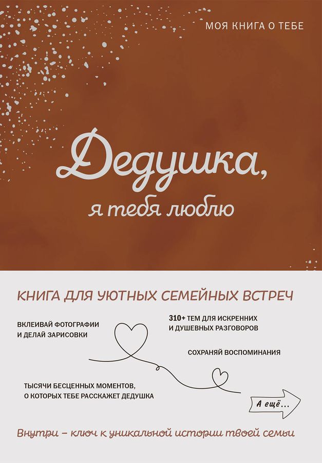 КНИГА ДЛЯ УЮТНЫХ СЕМЕЙНЫХ ВСТРЕЧ - КЛЮЧ К УНИКАЛЬНОЙ ИСТОРИИ ТВОЕЙ СЕМЬИ Наполните сердце вашего дедушки радостью, сказав: «Я люблю тебя! Расскажи мне, пожалуйста, о себе!» Узнайте лучше своего дедушку: какой он был в детстве, о чем мечтал, чему научился за свою жизнь и как стал таким, какой есть. Сохраните важные воспоминания и даже спустя много лет вы сможете возвращаться к книге, перечитывать и дополнять, а однажды прочитать своим детям и внукам, чтобы и они тоже узнали, каким необычным и интересным человеком был их прадедушка и прапрадедушка. • Как в его семье отмечали праздники, и какие традиции ему нравились больше всего? • В какие игры он играл с родителями? • Какое лето стало его самым любимым? • Как проходили тихие часы в его детском садике, и был ли ваш дедушка озорником? • Нравились ли ему полдники и обеды? • О чем он мечтал и как представлял себе мир взрослых, когда был ребенком? • Как ваш дедушка узнал страшную тайну о Деде Морозе? • Какой была его школа? Какие уроки были самыми любимыми? • За что он получил свою самую позорную двойку? • Как звали дедушкиных лучших друзей, и подшучивали ли они над учителями? • Как выглядела комната вашего дедушки? • Был ли он бунтарем в переходном возрасте? • Как проходили его выпускные экзамены? • Какой была его первая работа, и были ли у него хорошие отношения с руководством? • Как дедушка познакомился с вашей бабушкой и как сделал ей предложение? • Что он почувствовал, когда впервые взял вас на руки? Более 310 тем для искренних и душевных бесед с дедушкой! Эта книга — не просто семейный альбом или сборник вопросов. Эта книга — ваше признание в любви своему дедушке. Заполните ее вместе с ним или запишите ответы самостоятельно с его слов и создайте семейное древо. Если хотите, можете задавать вопросы последовательно, ведь все они расположены хронологически — от детства к нынешнему возрасту. Но на самом деле никаких правил нет! Можете начать диалог с любого места и дальше ориентироваться на ход беседы, переходя от раздела к разделу в зависимости от приходящих воспоминаний. Пусть эта новая традиция станет шагом к узнаванию уникальной истории вашей семьи. В книге вы найдете разделы: 1. Детские годы: семья и дом, детский сад, мировоззрение 2. Школьные годы: школа, семья и дом, друзья, мировоззрение в переходном возрасте 3. Студенческие годы: учёба, отношения, мировоззрение 4. Взрослая жизнь: работа, личная жизнь, мировоззрение 5. Наша семья Кроме того, в издании есть места для фото и заметок. Книга «Дедушка, я тебя люблю!» — это не только идеальный подарок для близкого человека на Новый год, день рождения, 23 февраля или день отца, но и ваш проводник в мир психологии и саморазвития, ведь узнавая свои корни, мы узнаем и настоящих себя, а значит, вы сможете разобраться и в вопросах к себе, которые у всех нас возникают в течение жизни. Издание подойдет и тем, кто ищет семейный фотоальбом необычного формата, и понравится вам, если вы обращали внимание на бестселлеры «С тобой я дома», «К себе нежно». Издание станет настоящим украшением книжной полки: у него отличное подарочное оформление, твердая обложка с приятным на ощупь покрытием софт тач, плотные страницы, цветная шелковая лента-закладка, съемный полусупер. Такие же книги мы сделали для мамы, папы и бабушки – «Мама, я тебя люблю! Моя книга о тебе», «Папа, я теб