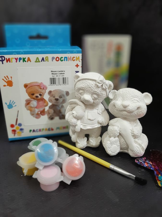 Фигурка для росписи с красками и кистью Мишка с рыбой и Мишка 2 фигурки в коробке Творим вместе ФК 21-204