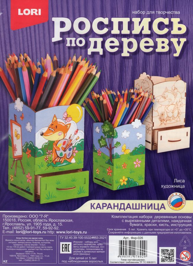 Комплектация набора: деревянные основы с вырезанными деталями, наждачная бумага, краски, кисть, инструкция.