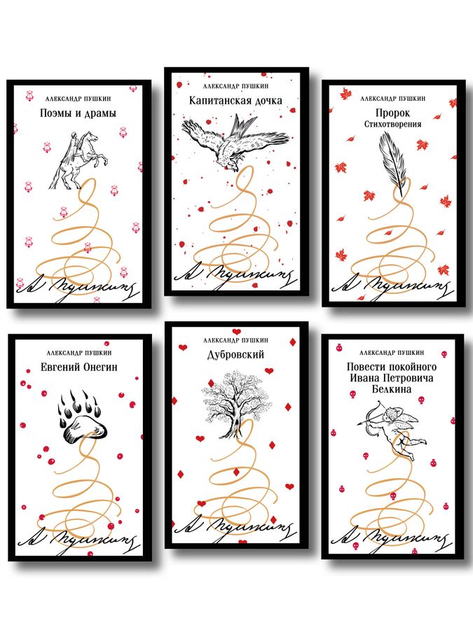 НАБОР ИЗ 6 КНИГ А.С. ПУШКИНА В СЕРИИ «МАГИСТРАЛЬ. ГЛАВНЫЙ ТРЕНД»: - «Дубровский»; - «Евгений Онегин»; - «Капитанская дочка»; - «Повести покойного Ивана Петровича Белкина»; - «Поэмы и драмы»; - «Пророк. Стихотворения» «Дубровский» Александр Сергеевич Пушкин заслужил титул не только «великого русского поэта», но и выдающегося сказочника, драматурга и прозаика. Его малую прозу отличает динамичный сюжет, гениальная простота изложения и харизматичные персонажи. В эту книгу вошли его повести «Роставлев» (написанная в ответ на одноименный роман Михаила Загоскина как попытка переосмыслить мотивацию главной героини), «Дубровский» (история о благородном юноше-мстителе), «Пиковая дама» (об азартном инженере Германне, которого страсть и алчность подтолкнули к безумию), «Кирджали» (о лихом разбойнике) и загадочная неоконченная «Египетские ночи» (вдохновленная историями о нравах времен Клеопатры). «Евгений Онегин» Культовый роман в стихах «Евгений Онегин» — это энциклопедия пушкинской эпохи, наполненная фразеологизмами, цитатами, намеками и аллюзиями, выискивать которые — настоящее удовольствие для читателя. Главный герой — щеголь и повеса, которому к двадцати шести годам успевают наскучить шумные балы и городская суета, получает в наследство от покойного дяди поместье и состояние и поселяется в деревенской глуши. Здесь он мгновенно становится предметом для сплетен и пересудов. А его высокомерие больно ранит влюбленную в него Татьяну Ларину. «Капитанская дочка» Юный дворянин Петр Гринев по воле отца вместо столичного Петербурга отправляется служить в крепость под Оренбургом. Вырвавшись из-под родительской опеки, он даже и не подозревает, что ему суждено оказаться в самом центре трагических и кровавых событий Пугачевского бунта. Удастся ли Гриневу, чудом избежавшему казни, остаться верным воинскому долгу и спасти любимую девушку из захваченной мятежниками крепости? Военно-историческая любовная драма от самого нескучного русского классика. Основано на реальных событиях. В книгу вошли повесть «Капитанская дочка» и историческая монография «История Пугачева» — детальное пушкинское исследование событий крестьянской войны 1773—1175 гг. под предводительством Емельяна Пугачева. «Повести покойного Ивана Петровича Белкина» Болдинской осенью 1830 года, находясь на трехмесячном холерном карантине, Александр Пушкин создал свой новаторский цикл «Повести покойного Ивана Петровича Белкина». В процессе сочинительства он также сформулировал свое прозаическое главное правило: писать четко, коротко и ясно. Рассказчик, вымышленный помещик Иван Петрович Белкин, оставил нам пять повестей, каждая из которых отражает свой литературный стиль. Так, «Выстрел» — это романтизм, «Метель», «Станционный смотритель» и «Барышня-крестьянка» — сентиментализм, а «Гробовщик» — вообще готическая повесть. В книгу также вошли исторический роман «Арап Петра Великого» и травелог Пушкина «Путешествие в Арзрум во время похода 1829 года». «Поэмы и драмы» Александр Сергеевич Пушкин заслужил титул не только «великого русского поэта», но и выдающегося сказочника, прозаика и драматурга. В сборник вошли его знаменитые «Маленькие трагедии» и историческая драма о Смутном времени «Борис Годунов». Кроме пьес в книге также собраны самые известные поэмы Пушкина, которые п