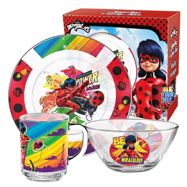 Набор детской посуды "Леди Баг и Супер-Кот". Посуда изготовлена из прочного прозрачного стекла, на поверхность которого нанесены изображения супергероини популярного мультфильма Леди Баг. Посуда отличается оригинальным дизайном в красных тонах. Набор детской посуды содержит тарелку (диаметр 19,5 см), салатник (12,5 см) и кружку (объём 230 мл). Подходит как для горячих, так и холодных блюд/напитков. Посуда детская представлена в презентабельной красочной коробке: готовый подарок для ребенка на день рождения! Набор детской стеклянной посуды будет радовать ребёнка во время приёма пищи: с любимыми героями завтрак или обед будет ещё вкуснее. Набор детской посуды не рекомендуется использовать в посудомоечной машине, СВЧ-печи, а также мыть при помощи жестких и абразивных моющих средств, не подвергать длительному воздействию солнечных лучей для сохранения яркости рисунка.
