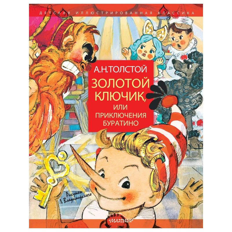 В книге А. Н. Толстого "Золотой ключик, или Приключения Буратино" есть всё, что так интересно читателю: увлекательные приключения, страшные злодеи, весёлые герои, добрые друзья и большая тайна, спрятанная на дне пруда… Всё это нарисовал художник Леонид Владимирский. Именно он в 1953 году создал образ Буратино, который с тех пор считается классическим — деревянный мальчишка с озорным взглядом и в красно-белом колпачке. По сказочной повести А. Н. Толстого были сняты фильмы, сделаны мультфильмы и поставлены пьесы. Буратино стал одним из самых известных персонажей детской литературы. Для младшего школьного возраста.