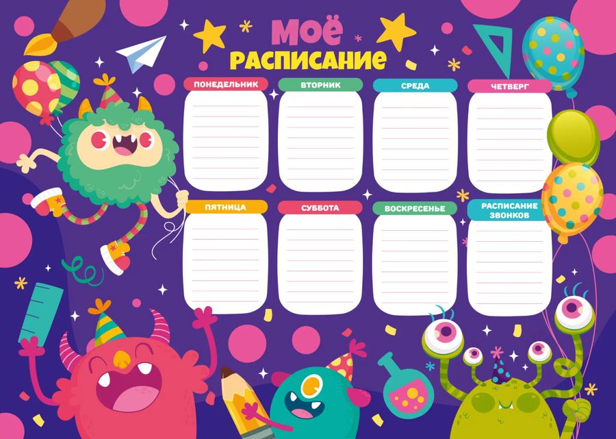 Расписание уроков Listoff – личный помощник ребят школьного и дошкольного возраста. Оно идеально подходит для планирования и подготовки заданий в домашних условиях. Для каждого ребенка очень важен распорядок дня. Наше расписание уроков дисциплинирует, учит самостоятельности и помогает рационально организовать время и подготовить все необходимое для следующих занятий.Расписание выполнено с отделкой выборочным лаком из высококачественной мелованной бумаги формата А3. Для удобства изображена вся неделя неделя с 7 строками на каждый день, а также расписание звонков.Подходит как для планирования школьных занятий, так и для расписания доп.секций и кружков по хобби.