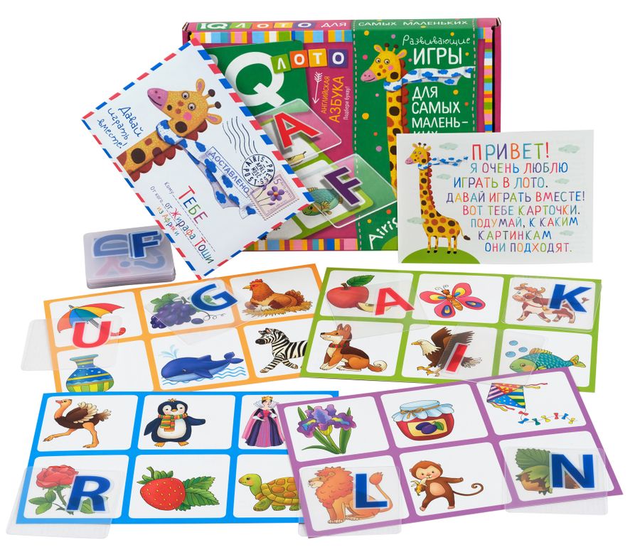 Лото разработано с учётом возрастных особенностей малышей. Играя в лото, ребёнок не только интересно проведёт досуг, но и быстро выучит все буквы английского алфавита. Основной принцип игры — подобрать к картинке букву, с которой начинается слово. В процессе игры малыш легко запомнит первые несложные слова на английском языке и научится их читать. В наборе 4 картонные карты, 27 прозрачных карточек и конверт, в котором ребёнок найдёт письмо от жирафа Тоши, а взрослые — инструкцию. Для детей от 5 лет.