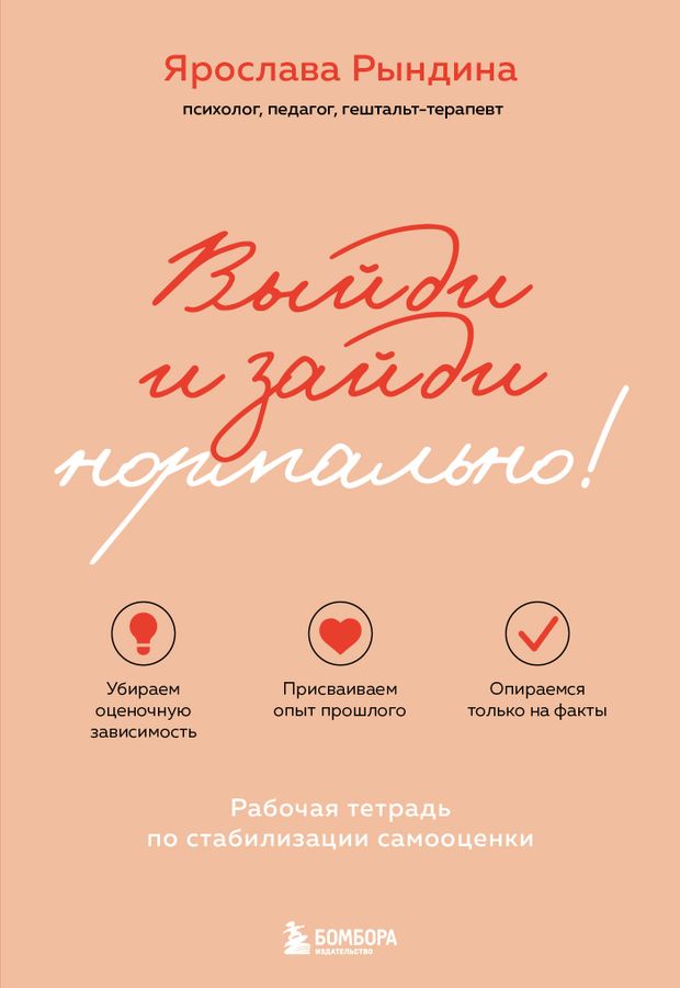 Ярослава Рындина — практикующий психолог, гештальт-терапевт, педагог, основатель центра психологии и педагогики «Ярко», автор курсов, семинаров и книг «Садись, пять!», «Не секрет: откуда берутся дети» «Выйди и зайди нормально» — это авторский воркбук по созданию и стабилизации самооценки. Рабочий инструмент, который поможет избавить себя от критических требований и перестать зависеть от чужого мнения и оценок. Рабочая тетрадь разделена на 4 блока, в каждом из которых представлены упражнения. Сделав их, вы: - перестанете сравнивать себя с другими; - сместите фокус внимания с оценок на факты; - создадите для себя ряд точек опоры; - поймете, какие потребности закрывают критические требования к себе; - научитесь управлять ролями своей личности; - разовьете умение присваивать себе благодарность.