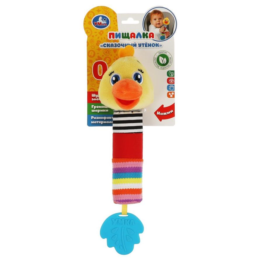 Текстильная игрушка-погремушка с пищалкой «Сказочный утенок» ТМ «УМка» разработана специально для самых маленьких: - гремящие шарики - пищалка - яркие цвета - разнофактурные материалы - шуршащие элементы - прорезыватель в виде листочка Эта игрушка в виде забавного утенка выполнена из очень мягкого и гипоаллергенного материала красочной расцветки. При нажатии игрушка издаёт забавный пищащий звук, а если её потрясти - весело загремят шарики, надежно спрятанные внутри. Прорезыватель интересной формы из качественного безопасного материала пригодится малышу, когда у него будут резаться зубки. Игра с игрушкой-погремушкой ТМ «УМка» развивает: - слуховое восприятие - тактильные навыки - моторику - цветовосприятие Размер с упаковкой: 5 х 17 х 29 см. Материал: пластмасса + текстиль. Рекомендовано детям раннего ясельного возраста.