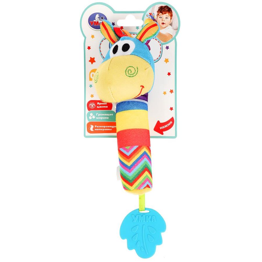 Текстильная игрушка-погремушка с пищалкой «Ослик» ТМ «УМка» разработана специально для самых маленьких: - гремящие шарики - пищалка - яркие цвета - разнофактурные материалы - прорезыватель в виде листочка Эта игрушка в виде забавного ослика выполнена из гипоаллергенного разнофактурного текстиля красочной расцветки. При нажатии игрушка издаёт забавный пищащий звук, а если её потрясти - весело загремят шарики, надежно спрятанные внутри. Прорезыватель интересной формы из качественного безопасного материала пригодится малышу, когда у него будут резаться зубки. Игра с игрушкой-погремушкой ТМ «УМка» развивает: - слуховое восприятие - тактильные навыки - моторику - цветовосприятие Размер с упаковкой: 3 х 24 х 15 см. Материал: пластмасса + текстиль. Рекомендовано детям раннего ясельного возраста.