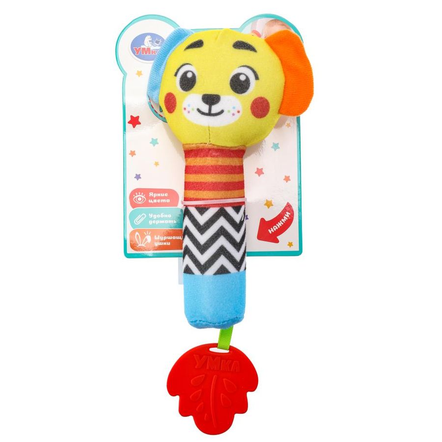 Текстильная игрушка-погремушка с пищалкой «Собачка» ТМ «УМка» разработана специально для самых маленьких: - гремящие шарики - пищалка - шуршащие ушки - яркие цвета - разнофактурные материалы - удобно держать - прорезыватель в виде листочка Эта игрушка в виде забавной собачки выполнена из гипоаллергенного разнофактурного текстиля красочной расцветки. При нажатии игрушка издаёт забавный пищащий звук, а если её потрясти - весело загремят шарики, надежно спрятанные внутри. Прорезыватель интересной формы из качественного безопасного материала пригодится малышу, когда у него будут резаться зубки. Игра с игрушкой-погремушкой ТМ «УМка» развивает: - слуховое восприятие - тактильные навыки - моторику - цветовосприятие Размер: 10 х 32 х 4 см. Материал: пластмасса + текстиль. Рекомендовано детям раннего ясельного возраста.