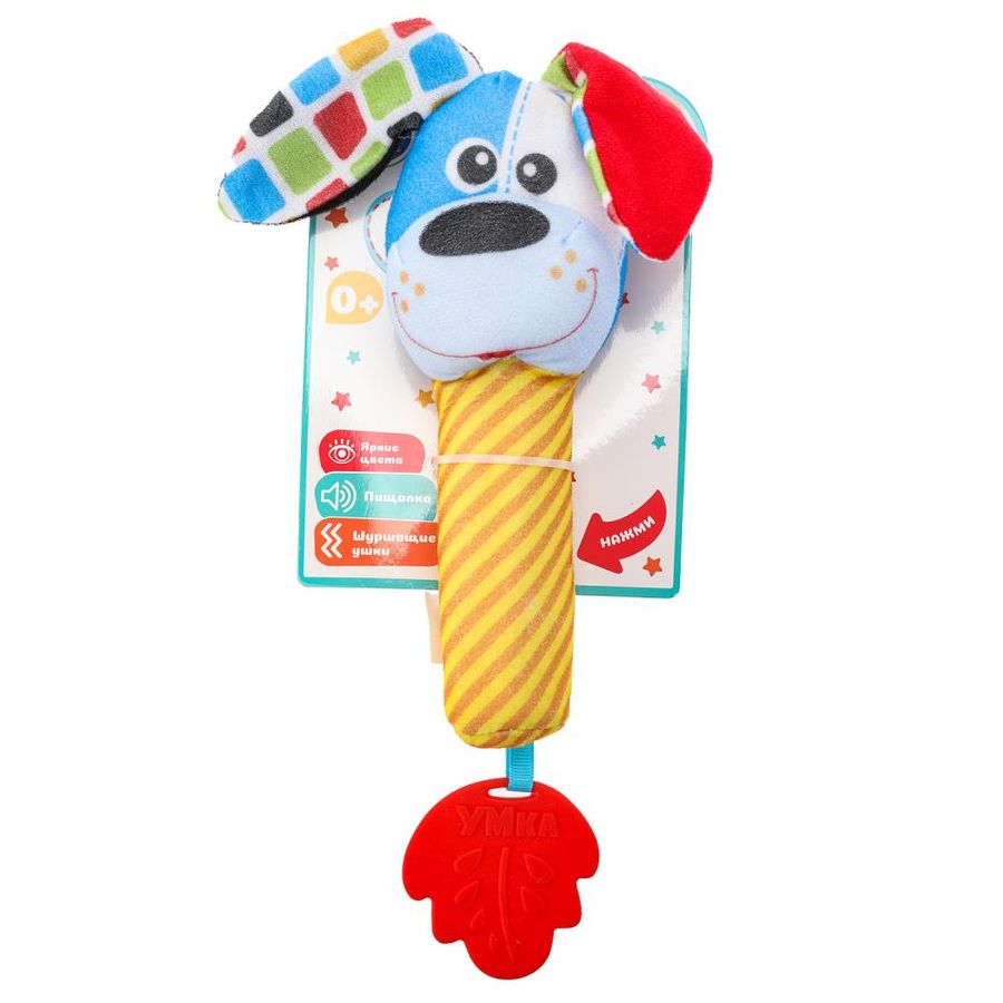 Текстильная игрушка-погремушка с пищалкой «Собачка» ТМ «УМка» разработана специально для самых маленьких: - гремящие шарики - пищалка - шуршащие ушки - яркие цвета - разнофактурные материалы - удобно держать - прорезыватель в виде листочка Эта игрушка в виде забавной собачки выполнена из гипоаллергенного разнофактурного текстиля красочной расцветки. При нажатии игрушка издаёт забавный пищащий звук, а если её потрясти - весело загремят шарики, надежно спрятанные внутри. Прорезыватель интересной формы из качественного безопасного материала пригодится малышу, когда у него будут резаться зубки. Игра с игрушкой-погремушкой ТМ «УМка» развивает: - слуховое восприятие - тактильные навыки - моторику - цветовосприятие Размер: 10 х 32 х 4 см. Материал: пластмасса + текстиль. Рекомендовано детям раннего ясельного возраста.