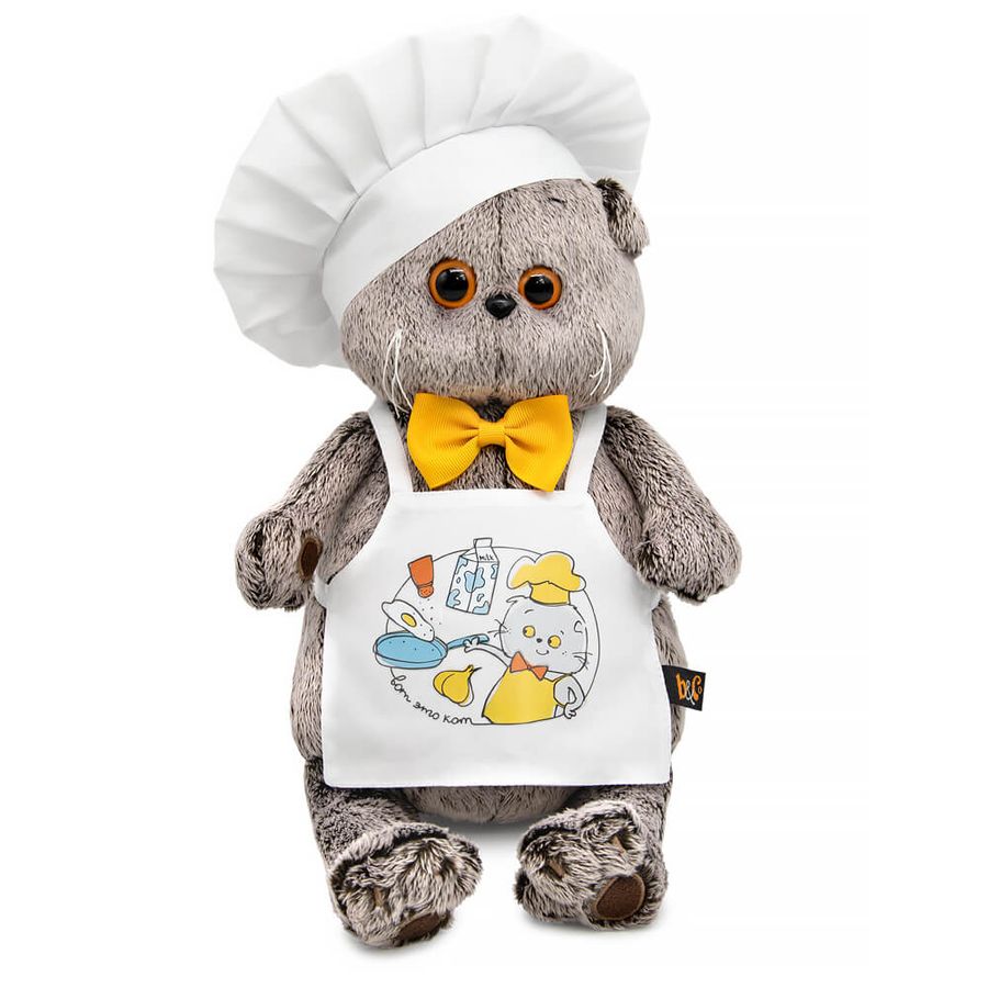 Басик снова в образе шеф-повара. На коте фирменный белый фартук с авторским принтом, объёмный поварской колпак из плотного белоснежного хлопка и неизменный галстук-бабочка.