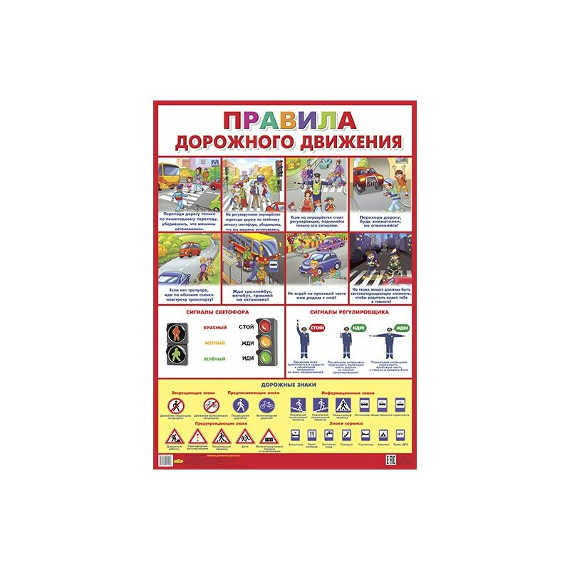 Обучающий плакат “Правила дорожного движения” познакомит детей с основными правилами, которые необходимо соблюдать пешеходу, а также с сигналами светофора и регулировщика, основными дорожными знаками.