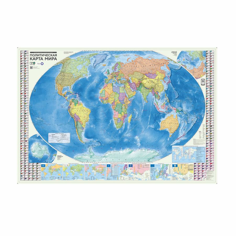 Пора изучать географию на 5+! «ПРОкарта» – новая линейка интерактивных карт с голосовым помощником и отличный тренажер для изучения географии. Найди на карте QR-код и смотри видео "Простой способ понять карту". Запусти навык "ПРОкарта. Мир политический" и используй один из 3 режимов или сразу все! Голосовой помощник поможет узнать новое, будет задавать вопросы, давать подсказки и попросит найти объекты на карте! С навыком легко изучить и запомнить политическую карту мира. На политической карте мира подробно отражено современное политико-административное устройство мира. Населённые пункты отображены по числу жителей и административному значению, показаны основные наземные пути сообщения и судоходные каналы. Дополнительно включена информация о международных организациях (ООН, ВТО и другие): хронология их деятельности, руководство, состав, статус и экономические показатели в виде схем и диаграмм. Отражена символика государств мира и территорий с особым статусом. У карты большой размер 157х107 см.